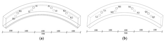 To evaluate the stress states of the two specimens during the loading process in more detail, eight strain gauges were installed on the top and bottom layers (Figure 6), and the load-strain curves at each position were shown in Figure 8. It can be seen from these figures that the H, I and K positions of the 3DPC thin-shell structure are all under pressure and all curves show obvious linearity in the initial loading stage. Curves slow down gradually until the surface layer is debonding. Figure 8d presents the changing state of the curve at J. At the beginning of loading, the general tendency is the same as that at H, I and K. However, when the load reaches 3.95 kN, the compressive stress condition of J1 is transformed into tensile stress, while J2 is still under pressure. It is the arch occurring at J under load which leads to the debonding of the fiber cement surface layer and FRP sheet, thus changing the stress state of the upper layer.