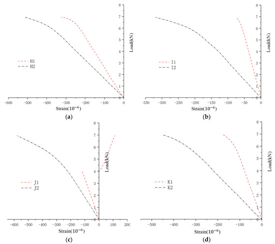 Load-strain relationship of the new composite thin-shell: (a) Position H; (b) Position I; (c) Position J; (d) Position K.