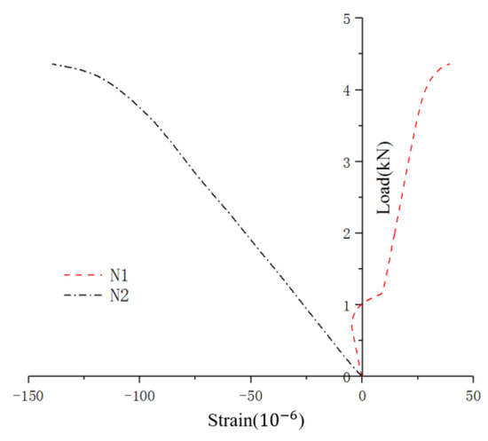 For the traditional concrete thin-shell structure, the force forms at the corresponding positions of L, M and Q are similar to the 3DPC thin-shell structure. Since position N is the initial damage position of the traditional concrete thin-shell structure, it is chosen as a representative in Figure 9. It can be observed that a continuous change of the force state occurs at position N. Before compressive strain reaches 5.04 μm/m, the load-strain curve at N1 shows a linear increase. Then, the compressive strain gradually decreases and the thin-shell structure changes the force state from compression to tension. The curve starts to increase linearly again until the tensile strain reaches up to 8.87 μm/m. Finally, as load increases to 4.36 kN, the ultimate tensile strain reaches at N1. N2 is still under pressure in the loading process. What is more, the curve enters the nonlinear stage when the load achieves 3.58 kN.