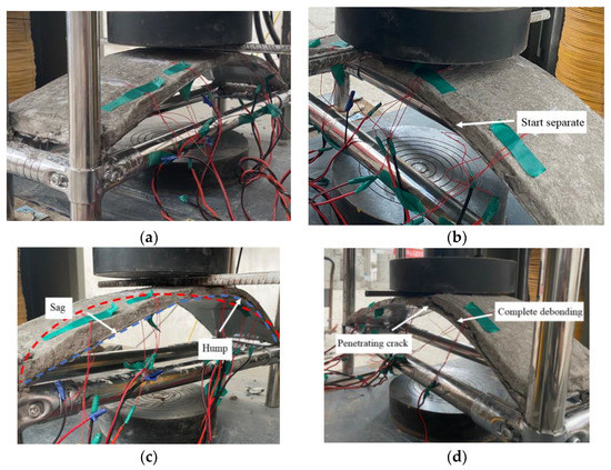 Failure pattern of the 3DPC thin-shell structure: (a) Elastic stage; (b) Nonlinear stage; (c) Separation stage; (d) Failure stage.