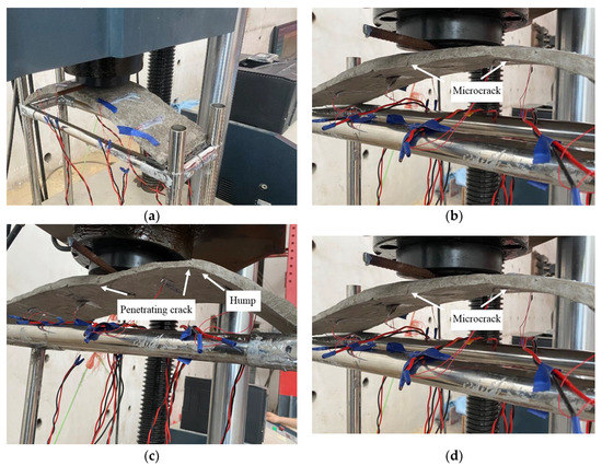 The failure modes of traditional concrete thin-shell structure are shown in Figure 11. It can be found that the bottom of the mid-span and N2 cracks occur, firstly under load, and the number of cracks in the arch increases gradually with an increase in load (Figure 11b). When the maximum bearing capacity is reached, penetrating cracks appear in the arch before mid-span, resulting in structural instability and buckling failure (Figure 11d). It can be seen that the failure form of the traditional concrete thin-shell structure is an asymmetric buckling failure.
