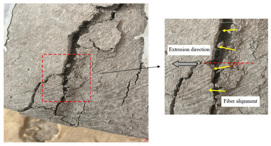 Figure 12 shows the penetrating cracks of the upper layer at J1 of 3DPC thin-shell structure. It is clearly seen that there are many cracks in the arch and the fiber distribution is more uniform. Through the partially enlarged view (right), it can be found that the included angle between the fibers and the extrusion direction is small and fibers are basically aligned along the extrusion direction, which proves again that the surface layer prepared by the nozzle extrusion process can obtain a good fiber alignment.