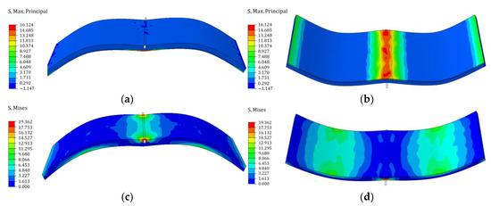 Max principal stress visualization: (a) Top of 3DPC thin-shell; (b) Bottom of 3DPC thin-shell; (c) Top of traditional thin-shell; (d) Bottom of traditional thin-shell.