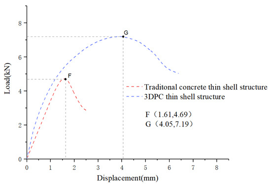 Figure 15 demonstrates the load-displacement responses of two thin-shell structures under single-point loading tests. According to the curves, in contrast to the traditional concrete thin-shell structure, 3DPC thin-shell structures with a reinforced FRP sheet have better bearing capacity.