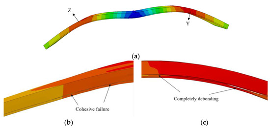 Debonding simulation of layers: (a) Displacement cloud map; (b) Cohesive failure; (c) Completely debonding.