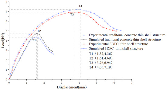 Figure 17 displays the comparisons of the simulated maximum bearing capacity of the 3DPC thin-shell structure and traditional concrete thin-shell structure with the experimental results. It reveals that the two curves of 3DPC thin-shell structure exhibit similar variation forms. Compared with the experimental results, the finite element simulation shows better performance. The experimental thin shell reaches the maximum bearing capacity of 6.94 kN at T3 and the corresponding maximum displacement is 3.76 mm, which is 3.6% and 7.7% lower than the finite element simulation results. This may be because the excessive viscosity value set by cohesive behavior exceeds the actual experimental value. When the experimental thin shell is peeling, the upper and lower layers of the simulated thin shell still bear loads together, leading to slow-developing cracks of the bottom fiber-cement layer, and a higher bearing capacity. Additionally, the default bonding strength of the joint surface set in the finite element simulation is uniform and equal, while the FRP sheet and fiber cement layer are not completely bonded tightly in the experiment due to improper operation and environmental conditions. When the layer begins to peel off, the stress at the arch of the fiber-cement layer increases suddenly, leading to an increase in the number of cracks in the tensile zone, thus reducing the ductility of the thin-shell structure. When the layer starts to peel, the stress at the arch of the fiber cement layer increases suddenly, leading to cracks increasing in the tensile zone, which reduces the ductility of thin-shell structure. However, the strength difference between the traditional concrete thin-shell experiment and simulation is because the slip between the structural reinforcement and concrete is not considered in the finite element simulation, resulting in large simulation results. There are more outside factors in the experiment which may affect the member strength.