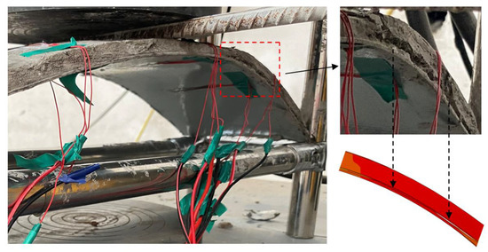 The results of the finite element simulation and experiment are shown in Figure 18, which shows that both debonding occur at the arch on the right side of the span. It indicates that the simulated surface debonding by cohesive behavior has practical reference value and is consistent well with the experimental phenomenon. It should be noted that in this experiment, due to the uneven bonding of layers, stress concentration occurs at the peeling location, resulting in the formation of penetration cracks and a decrease in ductility compared to the simulated value.