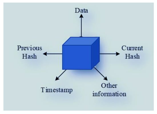 Recently, significant advancements in computer technology have enabled facility managers to record, store, manage, access, and communicate a wealth of information. Today, organizations can store, process, and analyze a large amount of data in the hopes of extracting meaningful information []. Blockchain technology has emerged as a revolutionary digital technology []. It can be employed for effective data sharing and data protection while improving interoperability and reducing costs. A blockchain is a decentralized ledger in which all blocks are linked together to track all the transactions [,,]. When data is recorded in the distributed blockchain ledger, this data is verified and then restricted access is made for amendment or deletion. Blockchains provide efficient and secure data storage and sharing of the dynamic records of value for facility services [,,]. Each facility service in the blockchain is treated as a block, which is composed of several elements as shown in Figure 1.