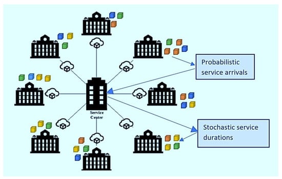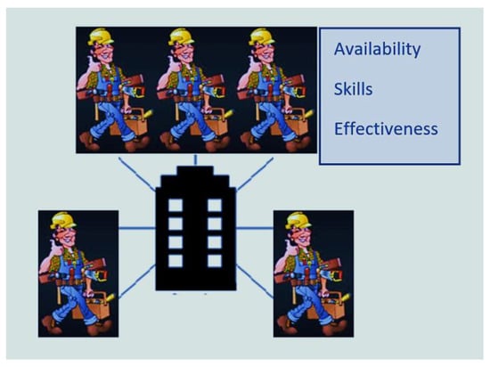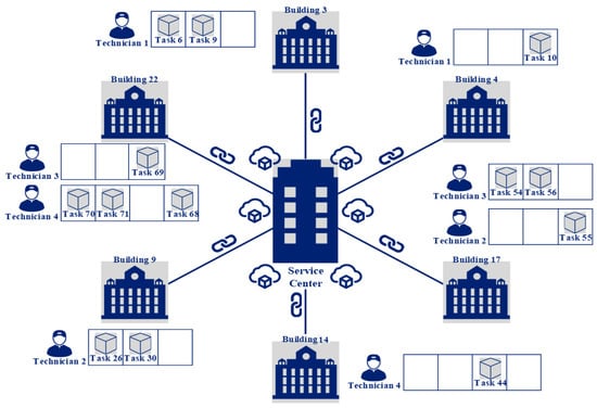 Typically, an organization is composed of several facilities as shown in Figure 2. The various facility service orders are sent via a cloud-based system or electronic system to the service center for planning and execution as shown in Figure 3. The service center is supported by skilled technicians who have specified skills and are responsible for performing the required facility services as shown in Figure 2. In this research, each service order is treated as a block with a pre-assigned due date and other relevant information regarding identification and tracking, type, and technicians’ skill requirements. An electronic facility service record (eFSR) is created for each building in the system. Each facility service may consist of one or more service tasks.
