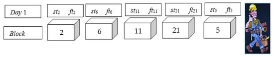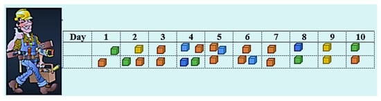 By solving the scheduling model using LINGO solver software, the obtained results determine the tasks assigned to every technician in each day, as illustrated in Figure 5.
