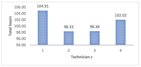 Given that 47 service orders (J = 47) of a total 140 tasks (K = 140) would be assigned to four skilled technicians (C = 4), comprising seven types (E = 7) during 12 intervals (I = 12), LINGO solver software employed to solve the optimization models using a computer with an Intel Core i7-9700 processor and processor speed from 2.5 GHz up to 4.70 GHz. The optimal number of tasks scheduled to each technician is presented in Figure 9.