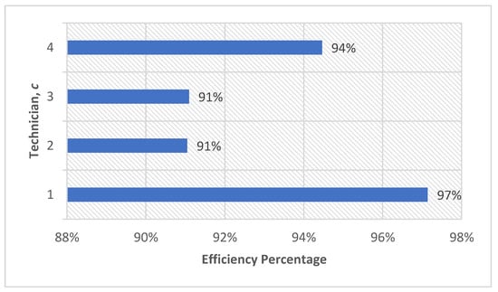 From Table 14, the total idle and overtime (hours) over 12 days were 9.56 and 8.34 h, respectively. In Table 15, the total cost incurred due to executing 47 service orders with 140 tasks from seven different types was $930.60. Moreover, no delay time incurred during sequencing the facility services. The efficiency for all technicians over a 12-day period was illustrated in Figure 14.