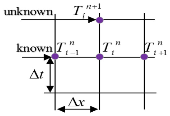 One can discretize Equation (1) to determine the evolution of temperature T (t, x) in the explicit form of the finite differences according to Figure 5, using the following approximation: and .