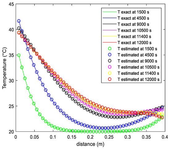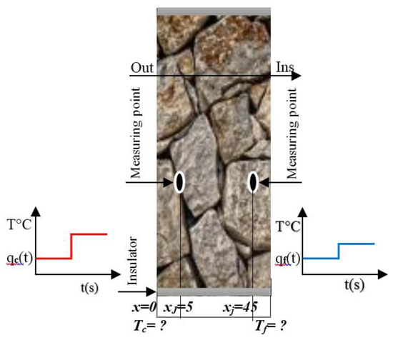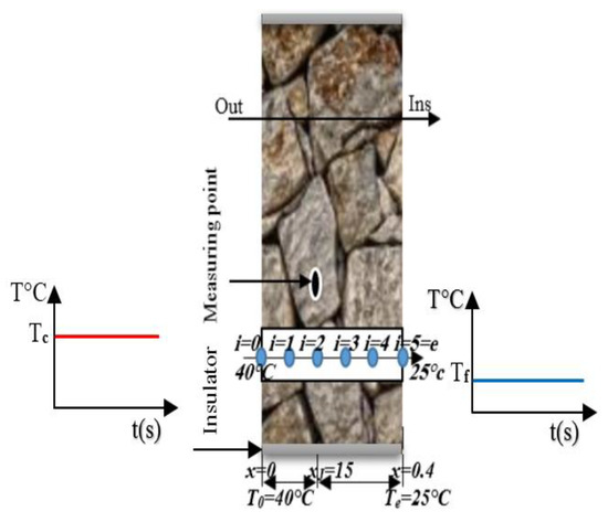Figure 4 shows the physical representation of the problem under consideration. The stone wall was 0.4 m thick. Initially, the ambient temperature was 20 °C. The supposed boundaries conditions are located at x = 0 m, where the hot temperature Tc = T0 = 40 °C, and at x = 0.4 m, the wall was maintained at room temperature Tf = Te = 25 °C.