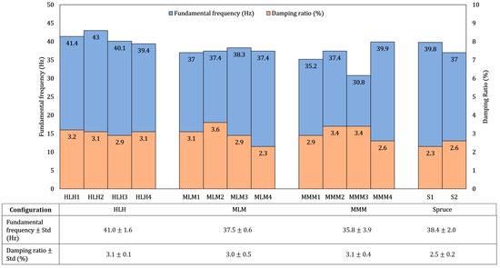 - Labonnote, N.; Rønnquist, A.; Malo, K.A. Prediction of material damping in timber floors, and subsequent evaluation of structural damping. Mater. Struct. 2015, 48, 1965–1975. [Google Scholar] [CrossRef]