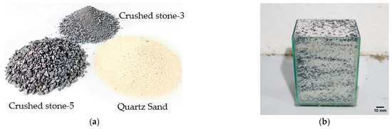 Agg-1 includes quartz sand and crushed stone-3. The results show that the porosity gradually decreases until the value reaches the minimum value (n = 0.302), corresponding to the mixing ratio of 30% quartz sand and 70% crushed stone-3, as shown in Figure 3. However, it shows an upward trend when the content of crushed stone-3 increases. The findings indicate that the value (n = 0.302) is the optimal porosity value in case Agg-1.