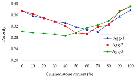 Similar experimental procedures and calculations of porosity were applied for Agg-2 and Agg-3. The present study investigated case Agg-2 with the ratio of two components (sand and crushed stone-5) varied from 0 to 100%. As shown in Figure 3, the porosity of Agg-2 decreases when the aggregate increases from 10% to 60%. However, from the value of 70% crushed stone-5, the porosity increases significantly. It can be seen that the angular shape of the particles can increase the gap between particles. Thus, the mixing ratio of 60% crushed stone-5 and 40% quartz sand was selected as the optimal value for Agg-2 (n = 0.294).