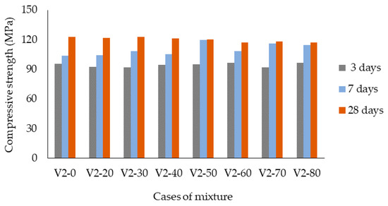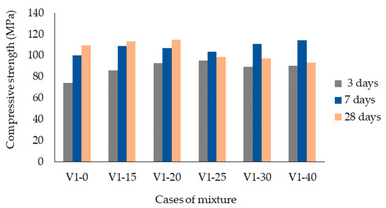 The compressive strength of the samples is shown in Table 6 and Figure 6. In cases (V1-0, V1-15, and V1-20), the compressive strength tends to increase during testing from 3 to 28 days. Most samples achieve the early high strength at 7 days, and case V1-20 gives the highest value at 28 days (114.60 MPa), corresponding to 20% slag content. However, cases V1-25, V1-30, and V1-40 show another trend compared with the other cases in group V1. The compressive strength in each case (V1-25, V1-30, and V1-40) reaches the highest value at 7 days. In addition, the compressive strength in the samples tends to increase at 7 days but decrease at 28 days with the rise of the slag ratio (from 25 to 40%). The deviation between the highest value (V1-20) and the lowest value (V1-40) at 28 days is 18.5%. It can be explained that the increase in the slag ratio in the total binder content leads to a decrease in the amount of cement. Therefore, the amount of Ca(OH)2 produced by the hydration process decreases, which induces the reduction of the C-S-H content. Moreover, if too much slag is used, the slag does not react completely, and the excess in the mixture affects the quality of the cementitious phase. These findings suggest that slag content should be selected equal to 20% of cement content to achieve optimal strength.
