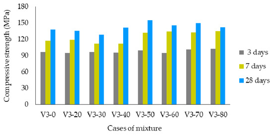 After 3 days of sample fabrication, the compressive strength increases by 70% compared with the value of 28 days and reaches about 80–95% at 7 days as shown in Figure 9. At 28 days, the compressive strength of the V3-50 sample reaches the maximum value (154.83 MPa). V3-50 denotes 50% silica powder and 50% slag in the total 40% cement content, corresponding to 20% of the cement content for each ingredient. Thus, V3-50 is the optimal ratio for the cement paste of the V3 group.