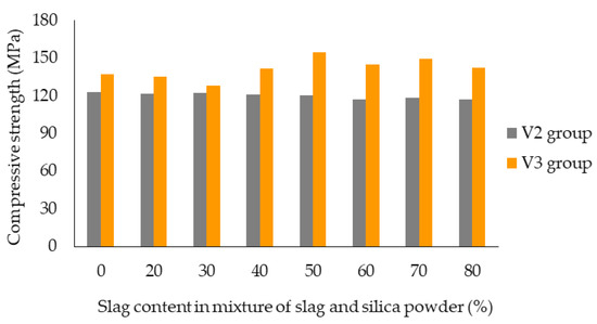 The compressive strength of the V2 group reaches approximately 100 MPa at the age of 7 days, and the strength is higher in the groups with a slag content of 50% or more. The compressive strength of samples in the V2 group at 28 days is relatively similar to each other, as shown in Figure 7. However, the strength at 28 days shows a slight decrease in slag content from 50% to 80% slag.