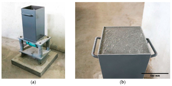 Testing the consistency of fresh concrete. (a) Container and vibration table, (b) Compacted concrete.