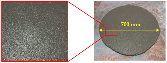The ratio of water to binder (W/B) is a necessary parameter in choosing the ingredients of the mixture. The ratio should be lower than the value of 0.25 to ensure a reasonable balance between the flow properties of the concrete and the strength of the hardened concrete [34]. The present study employed a W/B ratio (0.161). All samples of each group were checked for flow, as shown in Figure 4. After tapering, the mixture flowed evenly in all directions with a round shape. In addition, the surface of the cement paste did not show a stratification or water separation phenomenon. The samples were divided into three groups with the powder composition as follows: