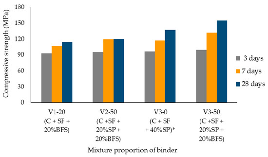 The highest compressive strength at 28 days of each group is collected and shown in Figure 15. V3-50 including cement, silica fume, 20% silica powder, and 20% slag achieves the highest value (154.8 MPa). The present findings indicate that the combination of both slag and silica powder (V3-50) is more effective than that of only slag (V1-20) or silica powder (V3-0) in the cement paste.