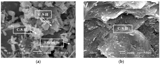 It can be seen that adding mineral admixture (silica fume and slag) enhances the microstructure and the compressive strength of concrete [39]. The reaction between slag and Ca(OH)2 increases C-S-H content which improves the strength of the hardened cement paste. The microstructure of the C3-50 sample at 28 days of age was investigated by the scanning electron microscope (SEM) method. Figure 16a shows the sheet-shaped C-S-H and needles crystals of ettringite. Moreover, the C-S-H crystal is recorded as a multilayered structure in Figure 16b. The multilayered crystal reflects the tightly packed and cohesive form [40,41], thereby increasing the compaction of the cement paste.