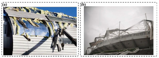 Example of wind damage to large-span roof structures: (a) Beijing Capital Airport T3 cover was lifted; (b) Zhejiang Jiaxing Pinghu gymnasium cover was torn.
