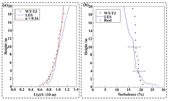 Comparison of wind fields: (a) mean wind speed profile; (b) flow turbulence profile.