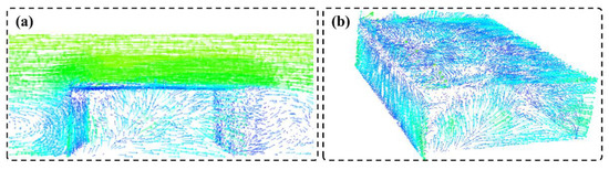 Average wind speed vector diagram of flow field: (a) overall flow field; (b) TTU model.