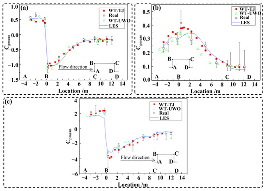 Comparison of pressure coefficients: (a) average pressure coefficient; (b) pulsation wind pressure coefficient; (c) peak wind pressure coefficient. A-B, B-C, and C-D are the windward wall, roof, and backwind wall, respectively.