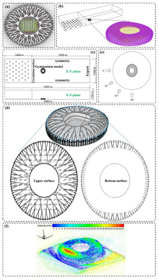 Stadium rendering and numerical simulation diagram: (a) render graph; (b) computational domain and model surface mesh distribution; (c) XY and XZ plane; (d) model measurement points arrangement; (e) wind direction angle setting; (f) wind speed vector diagram.