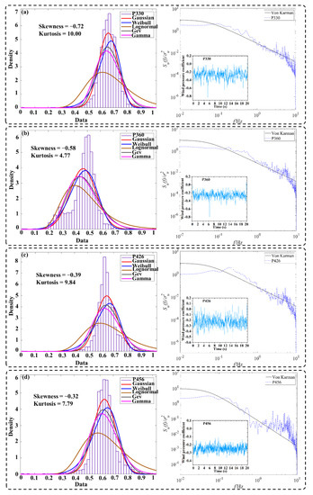 In this section, based on the above five probability density functions, the data from the representative measurement points (P330, P360, P426, and P456) on the surface of the model are fitted and analyzed by using the Matlab program for the standard normalization of the wind pressure coefficient time series (Figure 9) [39,40,41,42].
