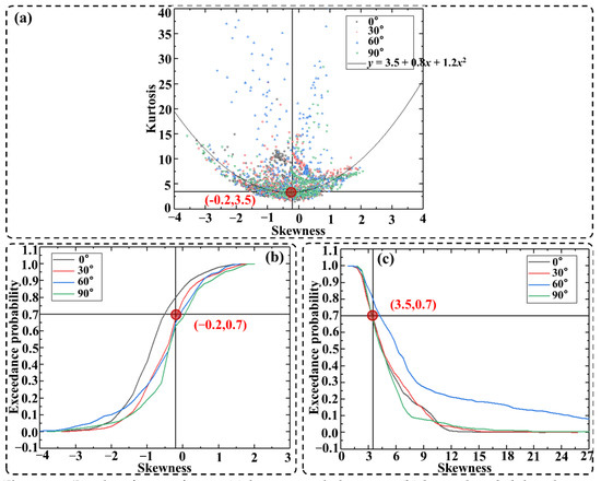 Sun [43] proposed two criteria to characterize the skewness and kurtosis-taking criteria for non-Gaussian characteristics: (1) the values of skewness and kurtosis should not bias from the skewness and kurtosis center matching curve; (2) the degrees of probability assurance within its variation are close. As shown in Figure 10a, the kurtosis and skewness of all points at different wind angles counted according to the above two guidelines can be fitted with a quadratic function () that satisfies criterion (1). The same criteria can be suggested to classify Gaussian and non-Gaussian regions for open prefabricated spatial grid structure surfaces at different wind angles. On the other hand, the probability densities of satisfying skewness and kurtosis are approximately equal (Figure 10b,c), both around 70%, following criterion (2).