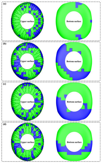 Division of Gaussian and non-Gaussian regions of the roof under different wind angles: (a) 0°; (b) 30°; (c) 60°; (d) 90°. The blue and green areas are Gaussian and non-Gaussian areas, respectively.