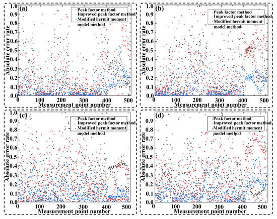 Absolute error rate of each measurement point: (a) 0° wind direction angle; (b) 30° wind direction angle; (c) 60° wind direction angle; (d) 90° wind direction angle.