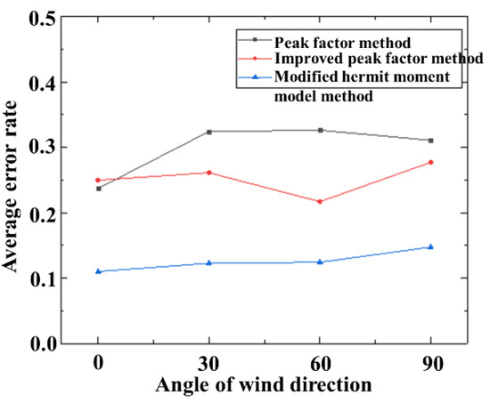 where represents the total number of measurement points on the surface of the open prefabricated spatial grid structure. The standard extreme wind pressure factor is the average of the observed extreme values (large or small) of the sample. Here, LES was performed six times under the same conditions for 504 measurement points on the surface, and six data samples with all times of 20 s were obtained. The mean of the observed extreme values of the first five samples was treated as the standard value to assess the merits of the extreme values derived from the above three methods for the sixth sample data. From the absolute error rate of each measurement point, it can be seen that with the change in wind angle, a large part of the error rate of the peak factor method and the improved peak factor method for the standard maximum value of wind pressure coefficient is above 20%, and even reaches 80% (Figure 12). Whereas the modified Hermite moment model method gives a more accurate estimation, the error with the coefficient is controlled within the 0–20% range, apparently better than the first two methods. Furthermore, the average error rate of the peak factor method and the improved peak factor method achieves 20–35%, with poor estimation accuracy. The modified Hermite method keeps it well within 10–13% (Figure 13).