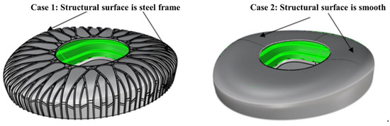 When the airflow arrives at the edge of the windward side of the open prefabricated spatial grid structure, separation and eddy shedding will occur, and a significant wind suction area will be formed at the separation and reattachment points. Subsequently, the airflow continues to move along the roof surface. Due to the roughness of the roof, its movement cannot be coordinated with the unique shape of the structure itself, leading to flow separation and the formation of various eddies. Therefore, to study the effect of stadium surface roughness on its surface extreme wind pressure distribution, the rough and completely smooth surfaces were set as working cases 1 (roughness height is 1.3 m) and 2, respectively, to explore the differences (Figure 14).
