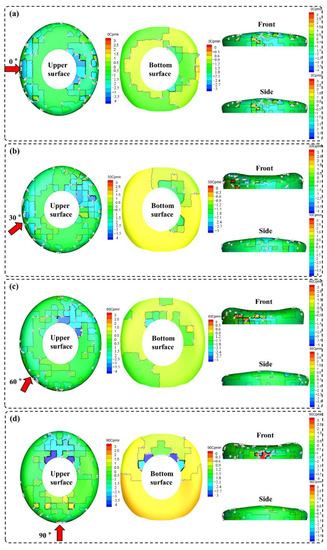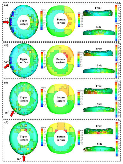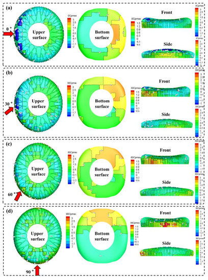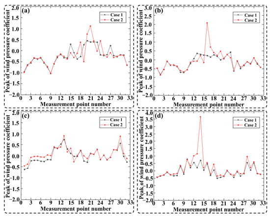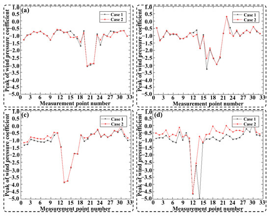 Maximum value of wind pressure coefficient at each wind direction angle for working case 1: (a) 0°; (b) 30°; (c) 60°; (d) 90°.