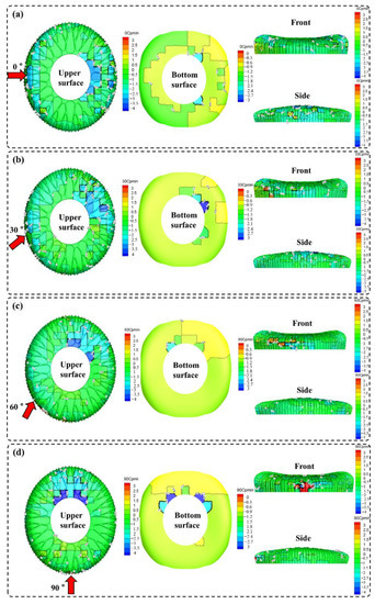 Maximum value of wind pressure coefficient at each wind direction angle for working case 2: (a) 0°; (b) 30°; (c) 60°; (d) 90°.