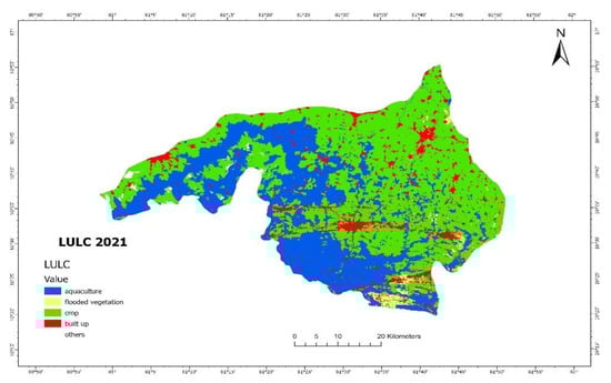Due to the aquaculture industry’s rapid expansion, which is causing dynamic changes in land use and land cover in the study region, the built-up area rose from 172.9 to 179.4 km2 (Figure 3) from 2020 to 2021 [45]. New highways were additionally needed to connect the newly created urban land.