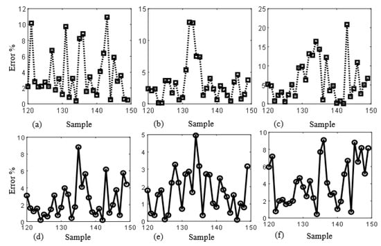 Prediction errors (%) of test data (20%) using ELM with (a) hyperbolic tangent, (b) sigmoid, (c) sinusoidal activation functions, CSO-ELM with (d) hyperbolic tangent, (e) sigmoid, (f) sinusoidal activation functions.