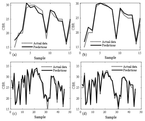 The predictions of the CBR test data utilizing Equation (11) as input weight matrix is provided in Figure 7a. For the comparison purpose, the standard ELM was also tested on similar scenarios, and results are illustrated in Figure 7b. In Table 4, the statistical measures are compared showing the additional benefits of the proposed algorithm.