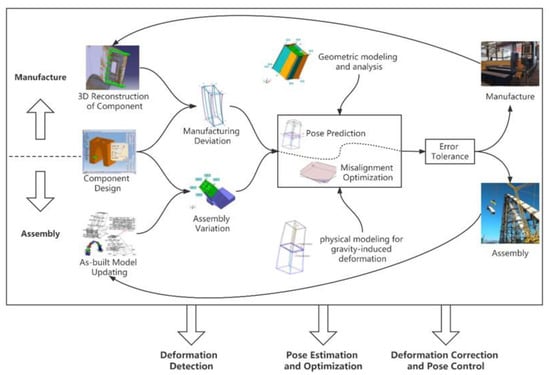 Steel structures in construction are sensitive to deformation [9,10]. Briefly, the current study focuses on the manufacturing process, installation process, 3D reconstruction, and reverse modeling [4,9,11]. For the assembly and manufacturing process, engineering quality control techniques, such as the thick plate welding technique and the twisted components machining technique, are still a popular topic around the world [6]. Moreover, methods involving computer science, such as the BIM technique, have been applied to construction for a while [12]. Based on this development, for example, 3D reconstruction in the data cross-validation process has been upgraded in various ways, such as the use of deep learning, computer vision, and multiple views [13,14]. An integrated model, benefiting from 3D reconstruction, structural analysis software, and sensors, can be used to construct a digital-twin-based framework to map a dynamic workflow in situ with simulations [15,16]. However, many questions still need to be answered. For instance, recent research has focused on the overall process of engineering projects, with either manufacturing or assembly. This separation has created an adjustment gap between deviations in manufacturing and variations in assembly due to the lack of mapping among digital models, production lines, and in situ methods [17]. Furthermore, informationization levels and methods of data acquisition still need perfecting and are undergoing improvements [18]. These shortcomings, such as the omission of deformation from self-weight and missing physical properties, create potential risks for the safety and reliability of entire projects [19].