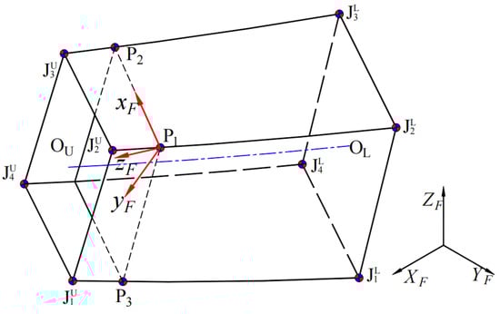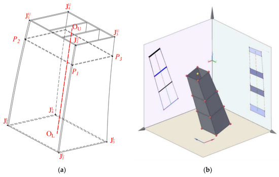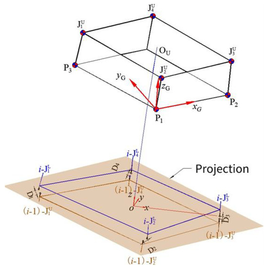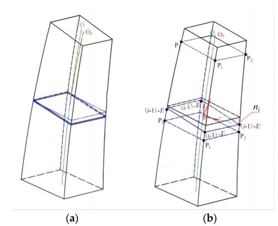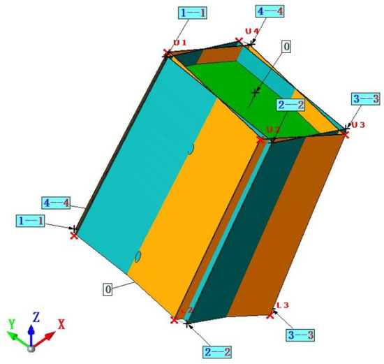 A single component has a total of 13 geometry control points, as shown in Figure 10 shown. represents the control points of a component of the upper port, and similarly, represents the control points of a component of the lower port. Control points, in this case, are located at an intersection directly obtained using the coordinates of the upper wall of a component. is the pivot point at the upper port of a component, and is the pivot point at the lower port of a component. The space between the pivot point of the upper port and lower port is the position of the simulation, and it is not involved in the data acquisition stage. represents the measurement points used to locate the component using the three-point technique. These layout points are somewhat flexible. They are generally set up near the outer side, where the first diaphragm of the upper port intersects with the side panels. The main reason for this placement, according to the relative position of each measurement point, , is that it is stable as a result of the rigid constraints of the diaphragm. The distance between the measurement points and the upper port is around 0.5 m~1.5m, and the deformation of the upper port related to the diaphragm is negligible.