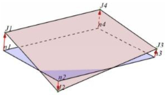 In this case, the steel bridge tower is a non-uniform-space structure, and its port has a tilted state. Therefore, precisely solving the gasket thickness of the geometry scale is difficult. As a result, combining the properties of the bridge with the analysis of assembly component variations on-site yields a mathematical algorithm (see Formula (13)), which is suitable for the calculation of the gasket thickness under four corners of the lower port to adjust the non-uniform steel tower’s position. This is convenient for the precision control of the assembly variations in the cable tower, as shown in Figure 7.