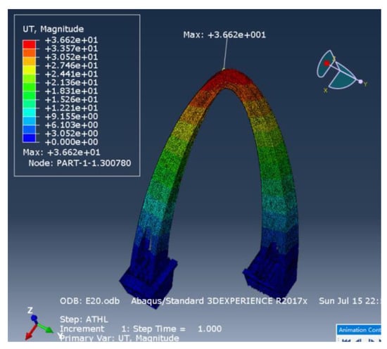 The ABAQUS model can accurately calculate the displacement resulting from self-weight in each or any particular construction stage (as shown in Figure 8 below). The pre-deformation value is calculated in ABAQUS according to the load of the dead weight. In the simulation, the pre-adjustment value of construction and the action of the self-weight load are considered to ensure that the displacement of the model, under the action of the self-weight load after pre-deformation, is as small as possible.