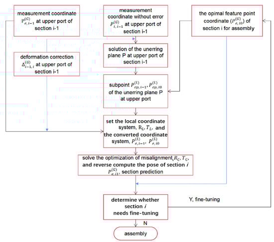 Next, the module of deformation correction and pose control proceeds to adjust the upcoming component according to data acquisition from the last module, and it keeps correcting and controlling the precision of the component. Analysis of the state of the docking port can validate whether it is within the error tolerance and can estimate the pose for component i after assembly. Component i is determined to decide whether it needs preprocessing, and assembly with geometry positioning is conducted according to the feedback. If the feedback is within the error tolerance, then geometry positioning starts after welding in situ, and component i+1 undergoes pre-work. If not, then it proceeds with fine-tuning.