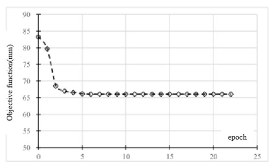 Building the objective function with Formula (5) and optimizing the calculations based on the BFGS quasi-Newton method are key to minimizing the value of the error. The initial value is zero in the optimization calculations and is assumed to be the initial state as well as the component assembled in the optimal space position. The value of the objective function with iterative calculations to improve the process is shown in Figure 13. The result shows that the target function value returns a downward tendency. The initial value decreased from 83 mm to 66 mm after 22 iterative calculations. According to the results shown in Table 6, the maximum deformation of each feature point on the upper and lower port projection is 10 mm, and the average value is 5 mm. Although the optimization process does improve the docking error variable, a gap still exists regarding the design requirements, which demand 2 mm as the docking error variable. The above error is a result of manufacturing deviations in the plates and welding shrinkage deformation of the plates. In fact, before formal welding, the local staggered deformation can be adjusted to the thermal orthosis process to ensure that the conditions of panel butt welding are met. Therefore, the optimized parameters (results seen in Figure 13 below) can be calculated to solve for the pose of the component assembled under the optimal port docking variation, according to Formula (2).